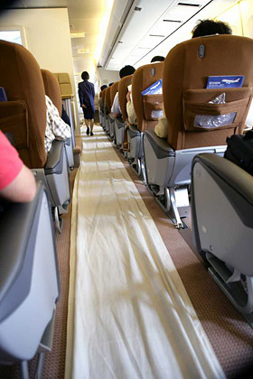 両陛下も乗られるため、取材とはいえ機内を不必要に汚さないよう、通路にも下足にもカバーをかける。 |